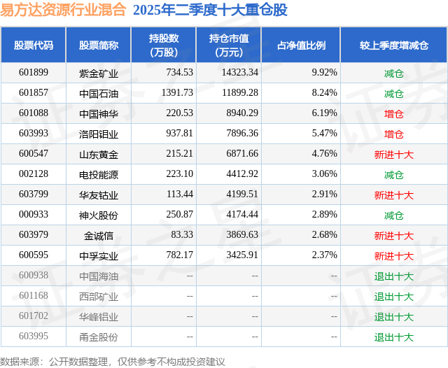 易方达资源行业混合的前十大重仓股如下: